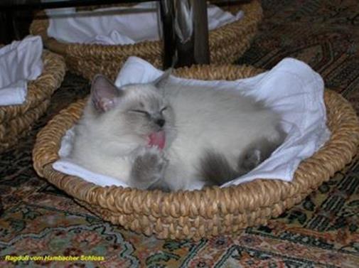 So sieht eine Katzenwäsche alla Momo aus—bevorzugt im Lieblingskörbchen. |