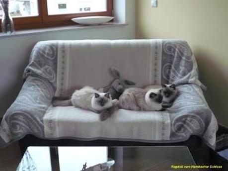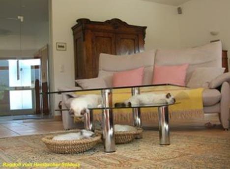 An einem heißen Sommertag bei uns im Wohnzimmer. Mimi und Momo in ihren Schlafkörbchen und die kleinen Bella vom Hambacher Schloss und Bonita vom Hambacher Schloss auf der kühlen Glasplatte unseres Wohnzimmertisches. |
